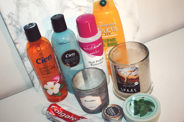 1. Leuk om te zien! De Cien Sunshine shower gel, Colgate tandpasta en SPAAS geurkaars heb ik ook opgemaakt. De body butter van TBS lijkt me heerlijk. Ik baal er zo van dat ik geen filiaal meer in de buurt heb X